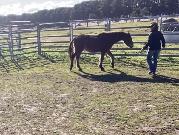 I am very excited to have welcomed home VBA Aztec, a 7 year old gelding from Kosciusko National Park. As we only had an hour journey home from VBA on Sunday I decided to start Monday morning with a brief training session looking to establish tracking and draw. Throughout the week I have continued working with Aztec for 15-20mins twice a day building on these skills. Currently Aztec will walk towards me when approached from a front on direction and follow me around the arena in a circle pattern. Aztec appears to be settling in well, befriending his neighbours, diving into his hay (I think he feels its rather nice to have no other mouths competition for food) and generally being easy going about the activities around the farm. He is naturally curious and shows a quiet bravery and a willingness to engage. To say he has stolen my heart already would not be a lie.