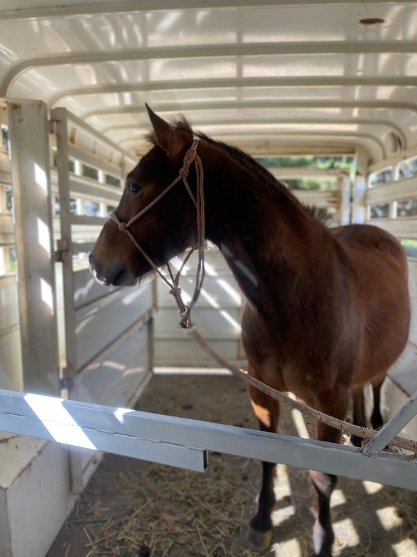 In addition to exploring the paddocks we have begun exploring different work areas of the farm moving through cattle races, grazing under enormous excavators and strolling down the driveway. I am amazed how Aztec takes these new challenges in his stride following along behind me and using his curiosity to explore. He has brought these characteristics in his approach to trailer loading showing interest and a relaxed approach to his training. In my approach to trailer loading, I encourage Aztec to step up into the trailer with his front feet, offer food reward and then step him off. With repetition I ask Aztec to stand longer each time aiming to step him out of the trailer before he asks to leave.