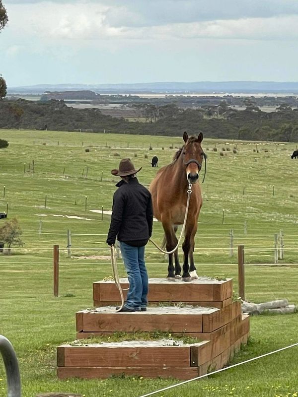 What an amazing two weeks it has been for Aztec and I since the last update as we have continued to work on established skills and develop these further. Saddle pads and saddling have expanded into mounting practice and learning to carry the weight of a rider. As with everything we do, slow and steady has made for good progress often repeating the process dozens of times, if not more. The biggest challenge I find when preparing to mount green horses is them going from seeing you on one side of their body to both sides. I pay extra attention to covering this before I actually sit on their backs initially standing on an improvised mounting block and laying my weight across Aztec and rubbing across both sides of the body. By breaking each step of mounting and sitting on their backs down into small pieces when it comes time to put it all together it is less concerning for them. We are now at the point where I can mount from a block and sit quietly on Aztec before dismounting. Eventually this will progress to forward movement and riding but whether we get there before Equitana remains to be seen as my main focus is that Aztec is a comfortable and willing partner in the whole process.